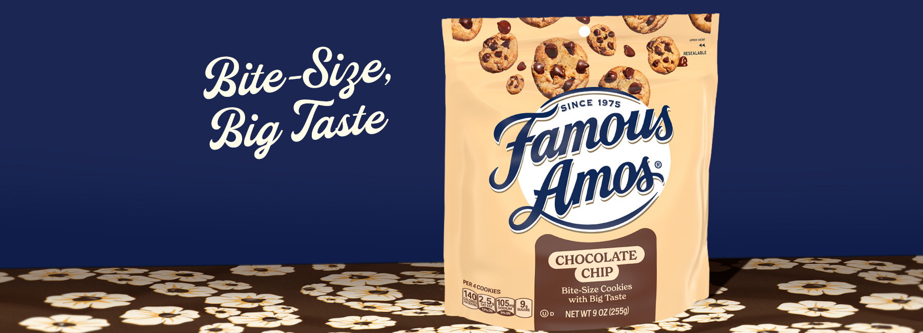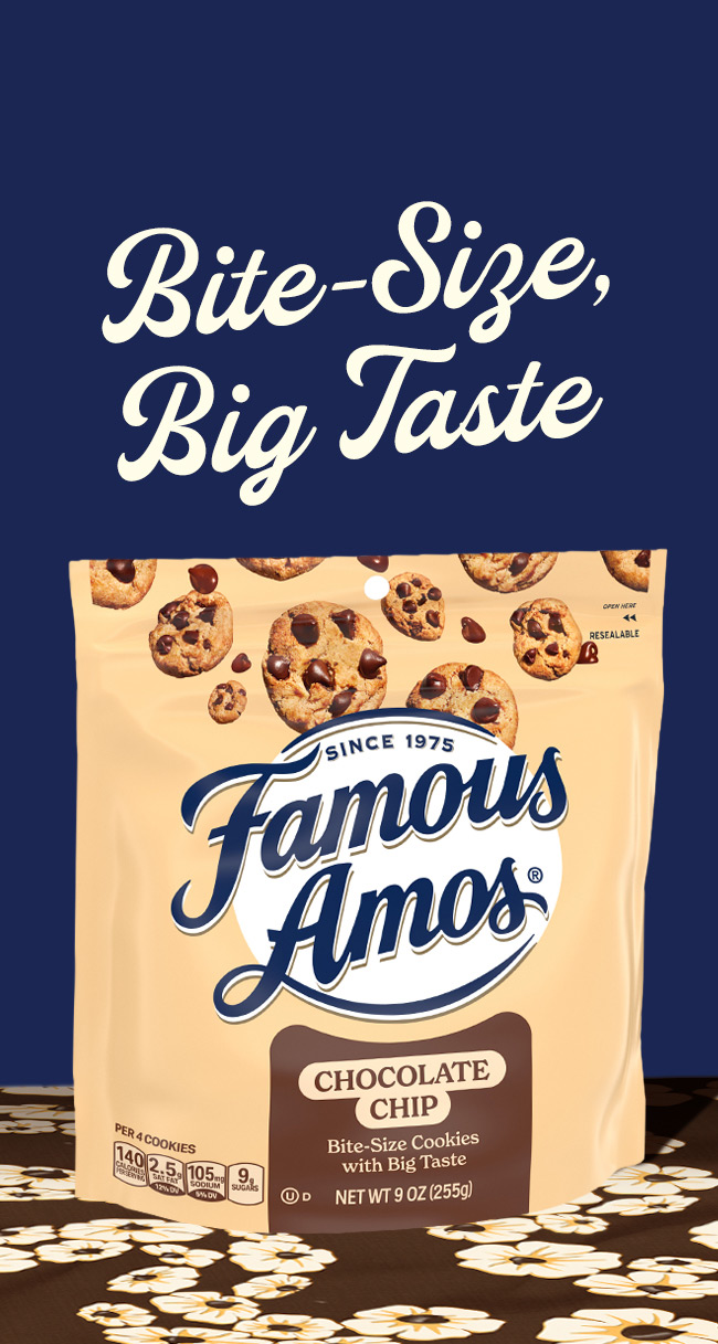 Our irresistibly crunchy bite-size cookies are filled with semi-sweet chocolate chips for a timeless taste that’s unapologetically Famous Amos. It’s everything you dig about chocolate chip cookies, all in one bite.
